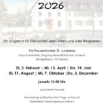 Ein Angebot für Menschen in Obwalden allen Alters und aller Religionen – eine Zusammenarbeit des Benediktinischen Zentrums und des Seelsorgeraumes Sarnen. Im Frauenkloster St. Andreas Haus Scholastika, Eingang Benediktinisches Zentrum, Brünigstrasse 159, Sarnen Kollekte Kinder bis 12 Jahre nur in Begleitung Erwachsener Beschränkte Platzzahl Anmeldung spätestens drei Tage vor dem Termin. Die Anmeldung erfolgt über[..] » weiterlesen ...